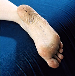 point (sore area over the heel/ proximal foot) by palpation and mark