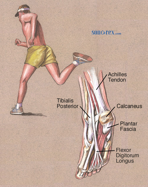 ![]() Tendinite du tendon d'AchilleLe tendon d'Achille est le gros tendon qui relie les deux principaux muscles des mollets à l'os du talon. ![]() Il s'agit d'un endroit où de nombreux athlètes subissent des blessures dues à l'usage excessif. Cela consiste en une inflammation au niveau du gros tendon qui se fixe à l'os du talon (calcanéum.) Il en résulte une douleur spécifique localisée à l'arrière du talon, douleur aggravée par l'activité physique, surtout la course à pied. On la retrouve aussi dans les sports d'équipe, de raquettes et chez les skieurs. L'inflammation de la bourse (bursite) adjacente au tendon peut engendrer des symptômes similaires. Des blessures aux autres tendons avoisinants peuvent aussi survenir.